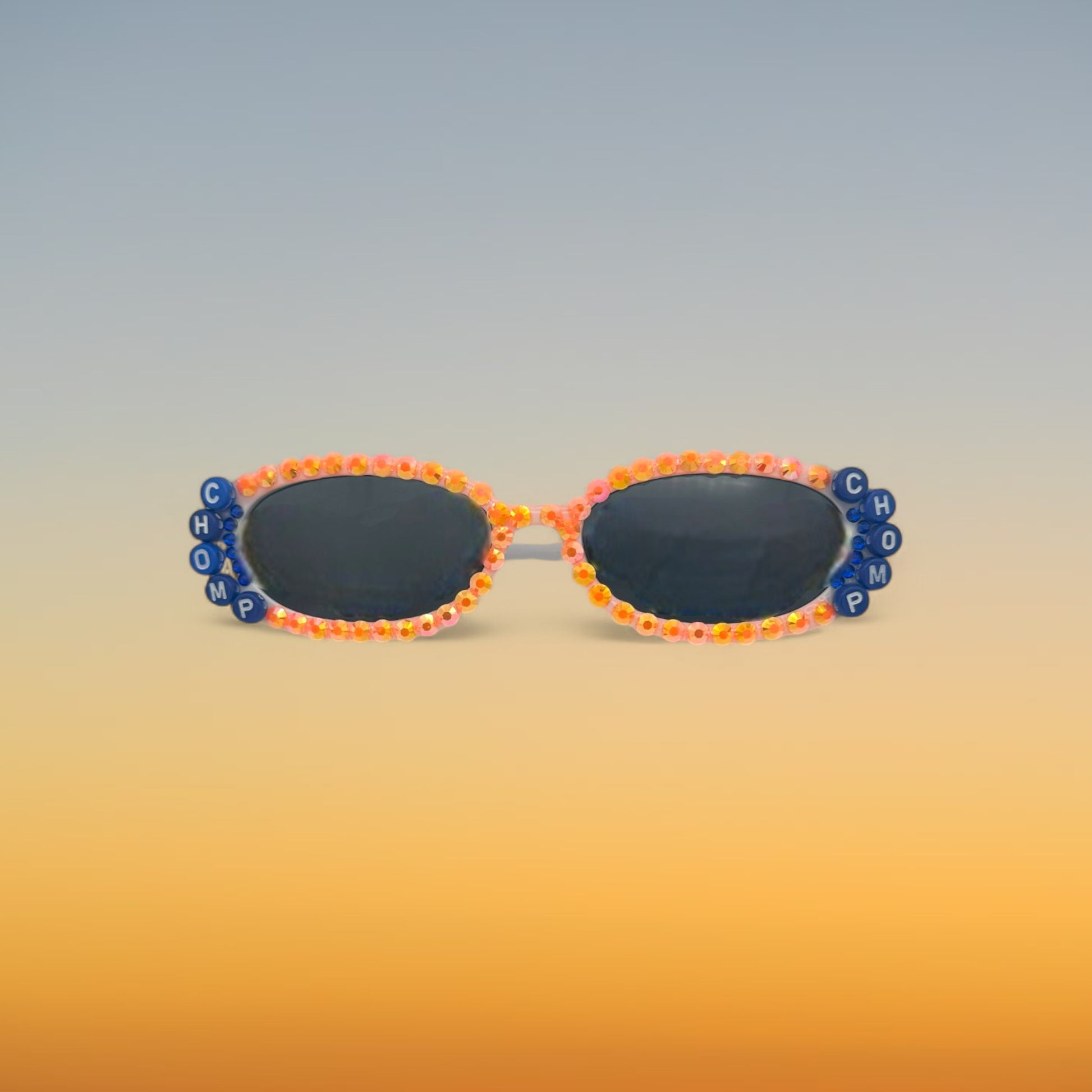 Florida fans, it’s time to shine bright and chomp hard! The Chomp Chomp Game Day Sunnies bring retro ‘90s vibes with a bold oval frame that’s perfect for game days, tailgates, and making sure you’re Jumbotron-ready. Decked out with shimmering orange studs along the top and bottom, these sunnies are all about big energy and even bigger style. The sides rep "Chomp Chomp" loud and proud—because every true Gator knows, it’s always game time.