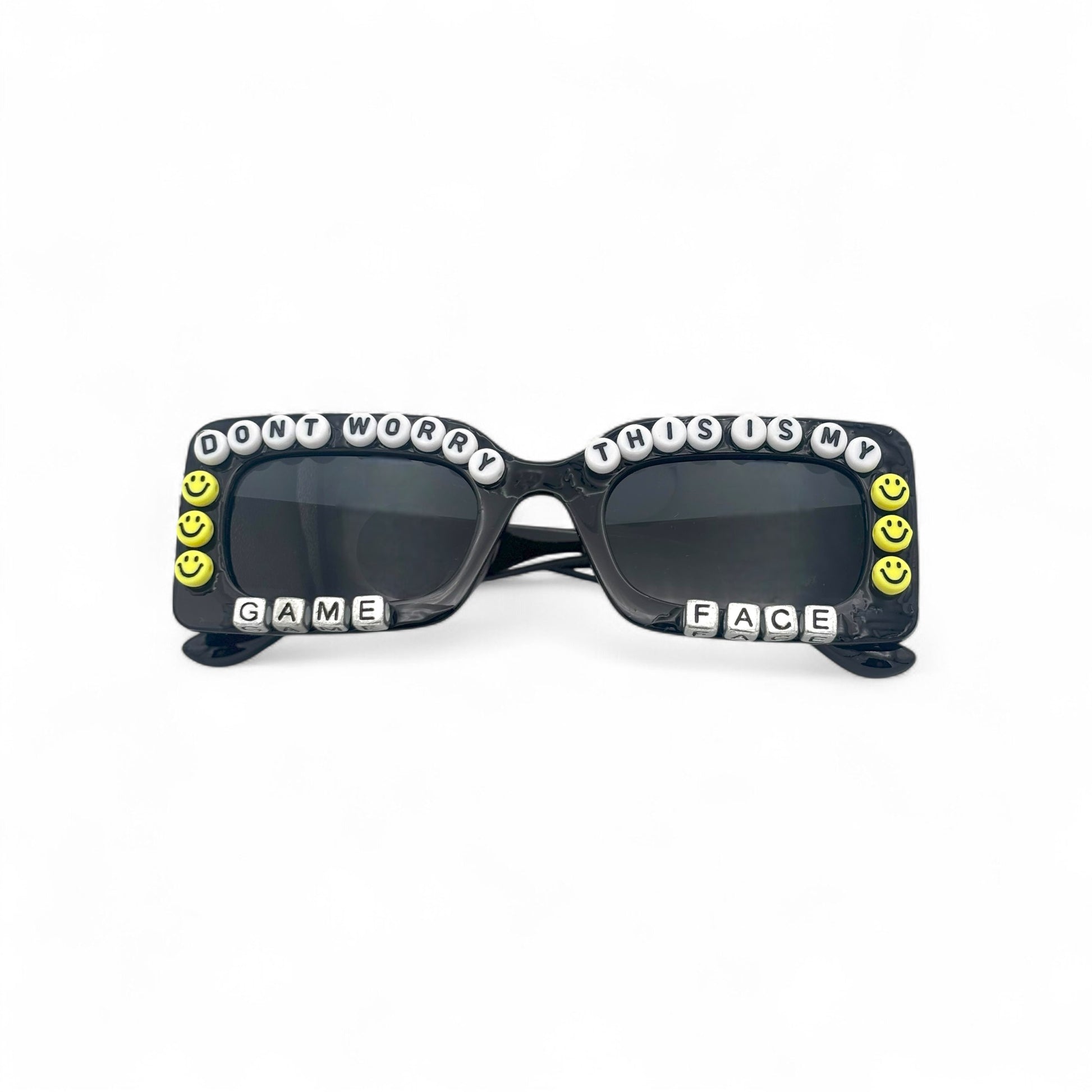 Don’t worry—this is my game face. These rectangle sunnies bring bold energy and effortless cool to the bleachers. Featuring smiley face accents and your choice of frame color + custom charms, this pair is all about showing up with style and serving sporty slayage.