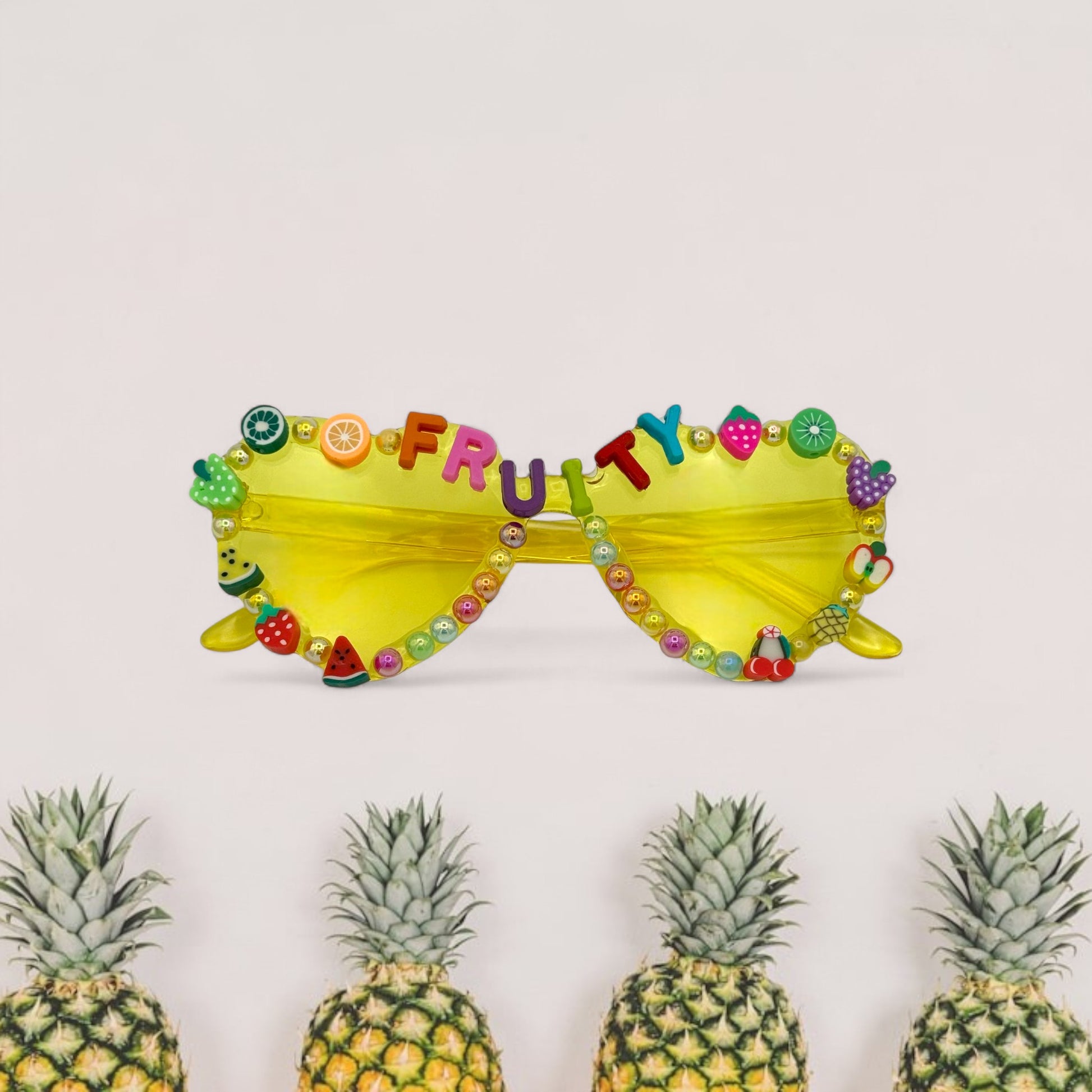 These colorful heart-shaped sunnies are all sass, no subtlety. With “FRUITY” spelled across the top in bold, bright rainbow letters, shimmery pearl accents, and actual fruit charms (yes, really—think strawberries, pineapples, and juicy citrus), this pair is ready to turn every sidewalk into a catwalk.
