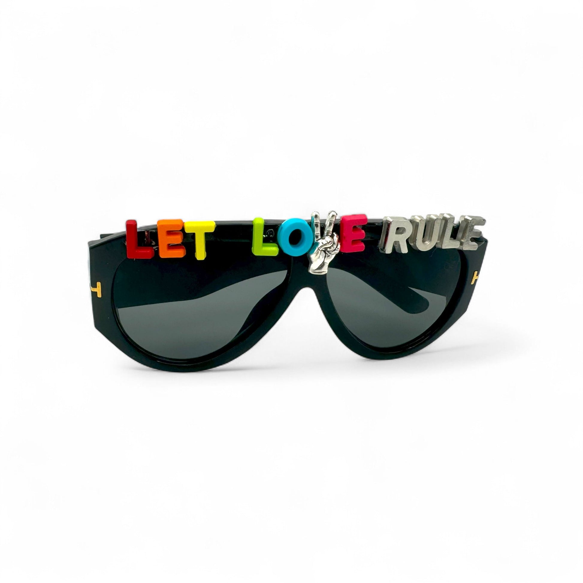 🖤 Retro black aviator frames with bold “LET LOVE RULE” lettering—featuring a silver peace sign hand for the “V”